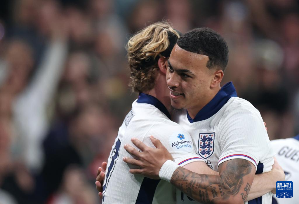 10月9日,英格兰队球员罗杰斯(右)进球后与队友庆祝。