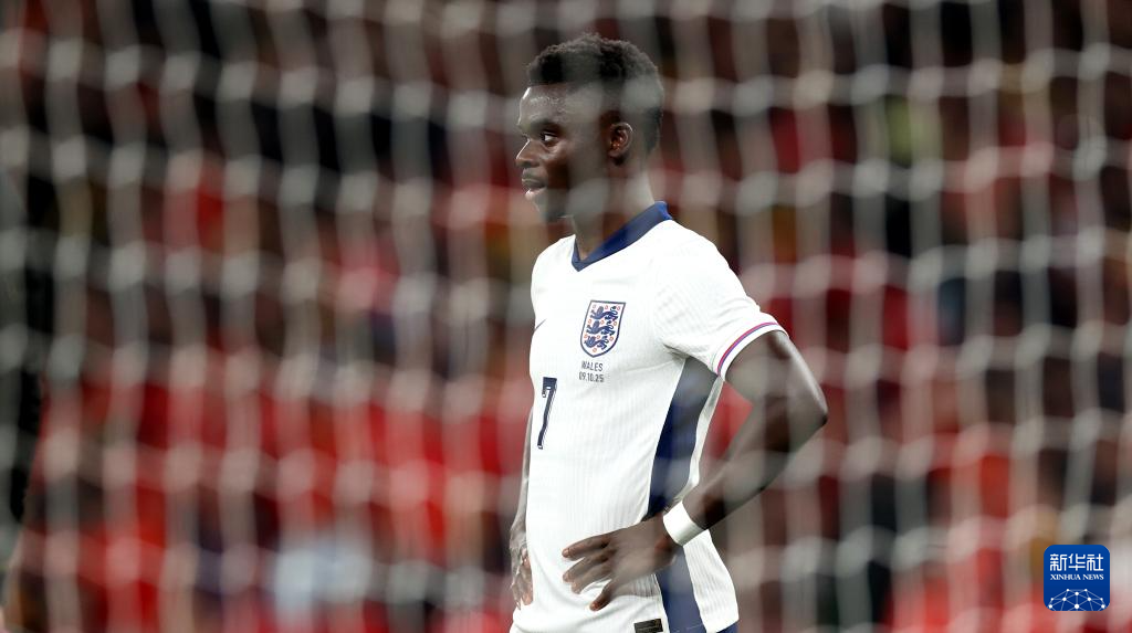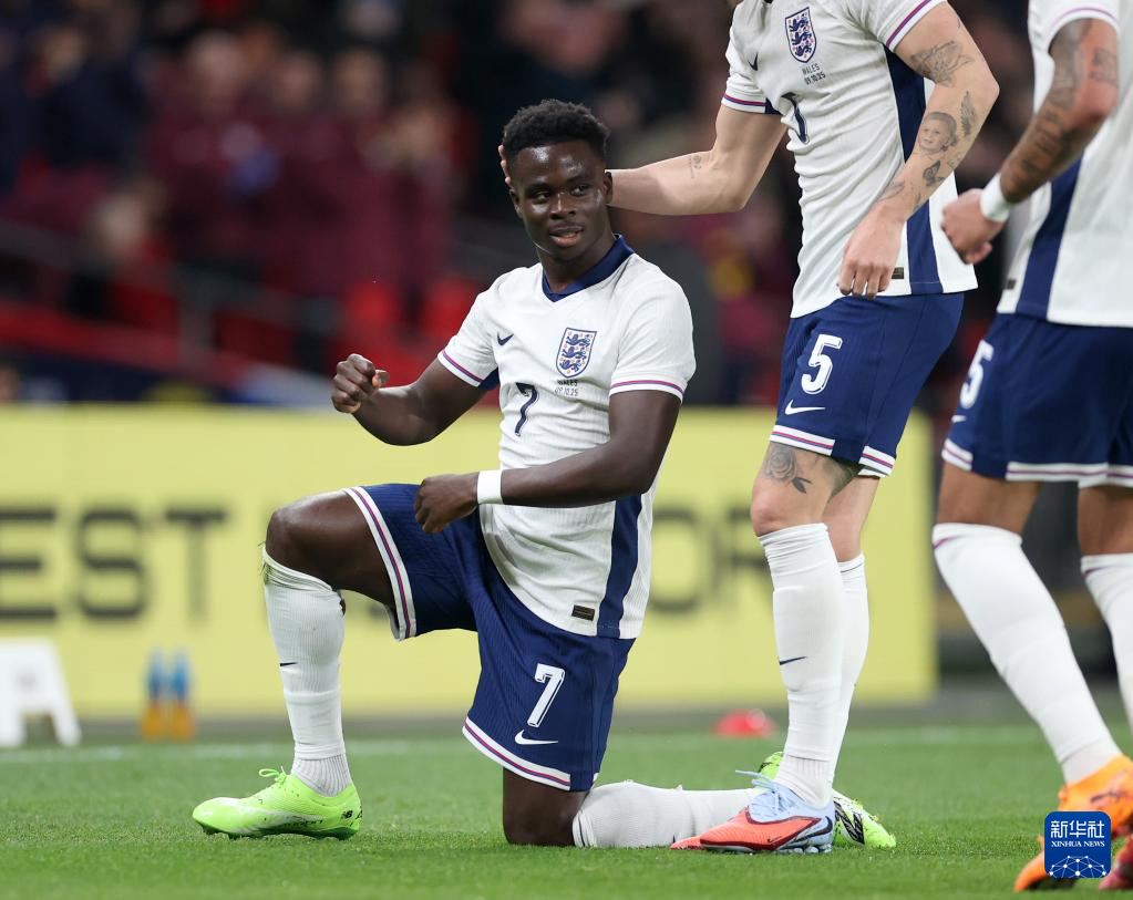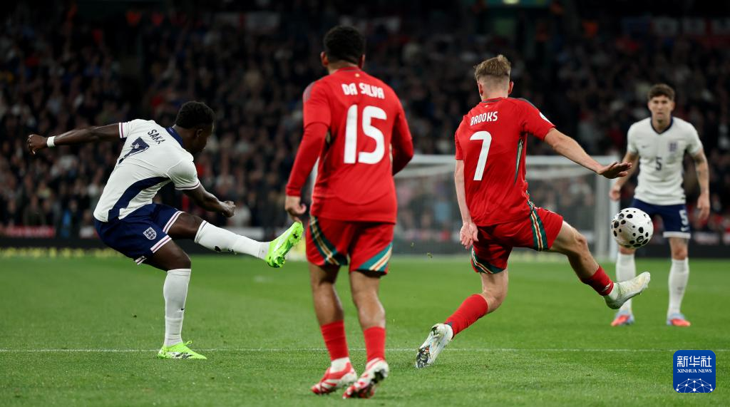 10月9日,英格兰队球员萨卡(左一)在比赛中射门得分。