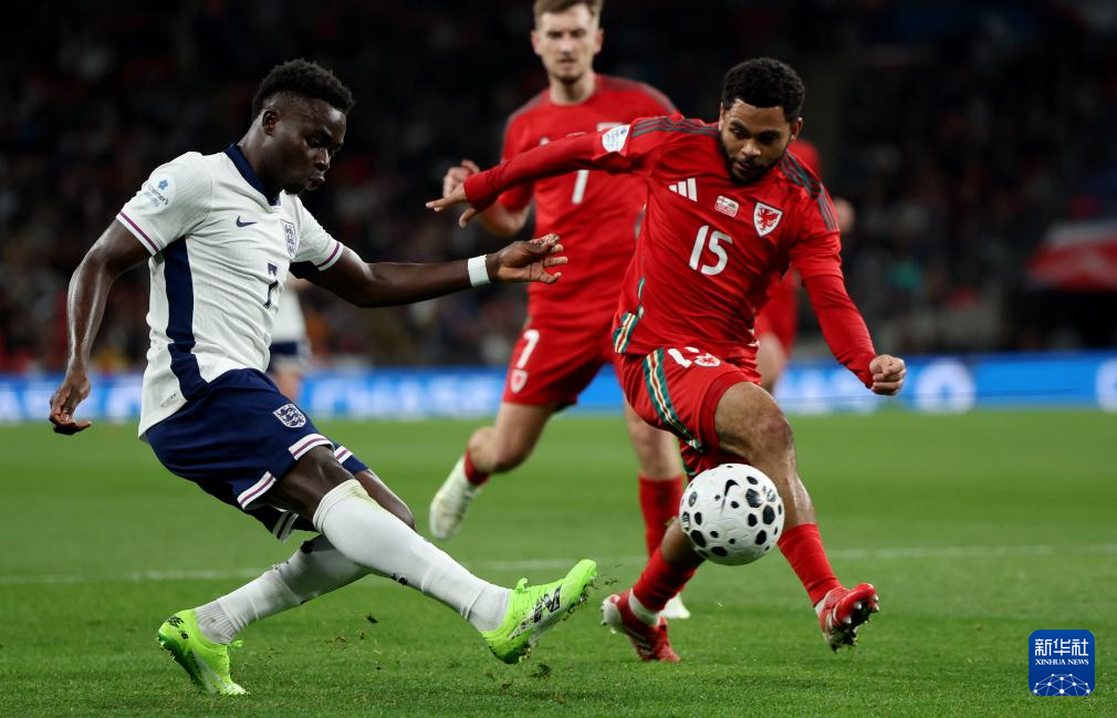 10月9日,英格兰队球员萨卡(左)与威尔士队球员达席尔瓦拼抢。
