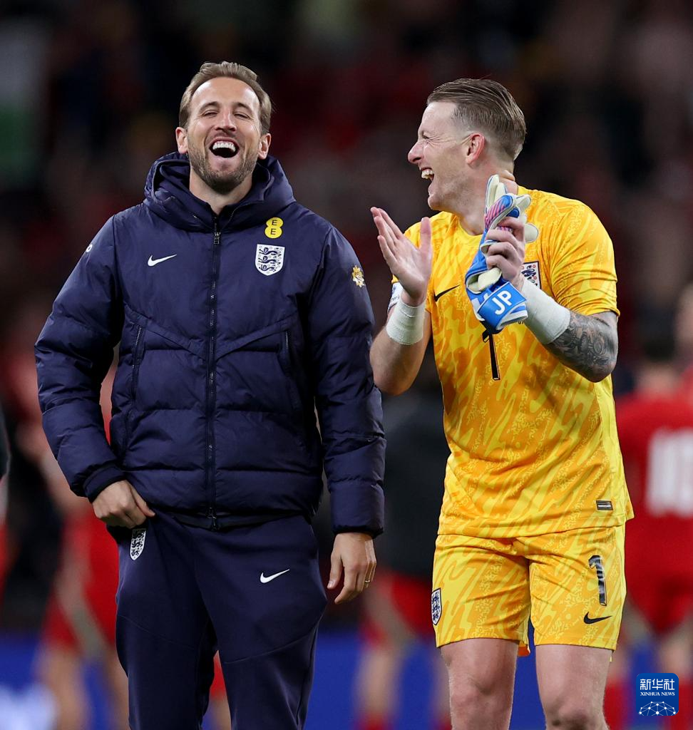 10月9日,英格兰队球员凯恩(左)与门将皮克福德在比赛后交谈。