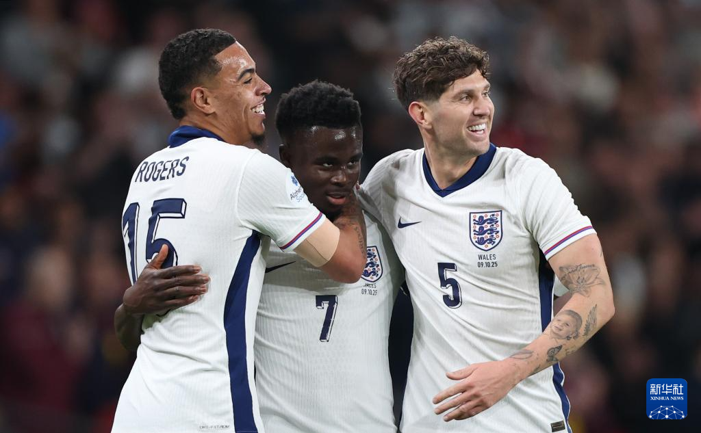 10月9日,英格兰队球员萨卡(中)进球后与队友庆祝。