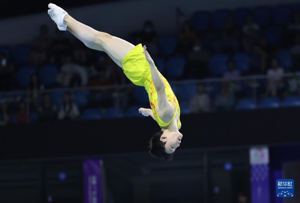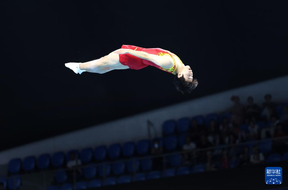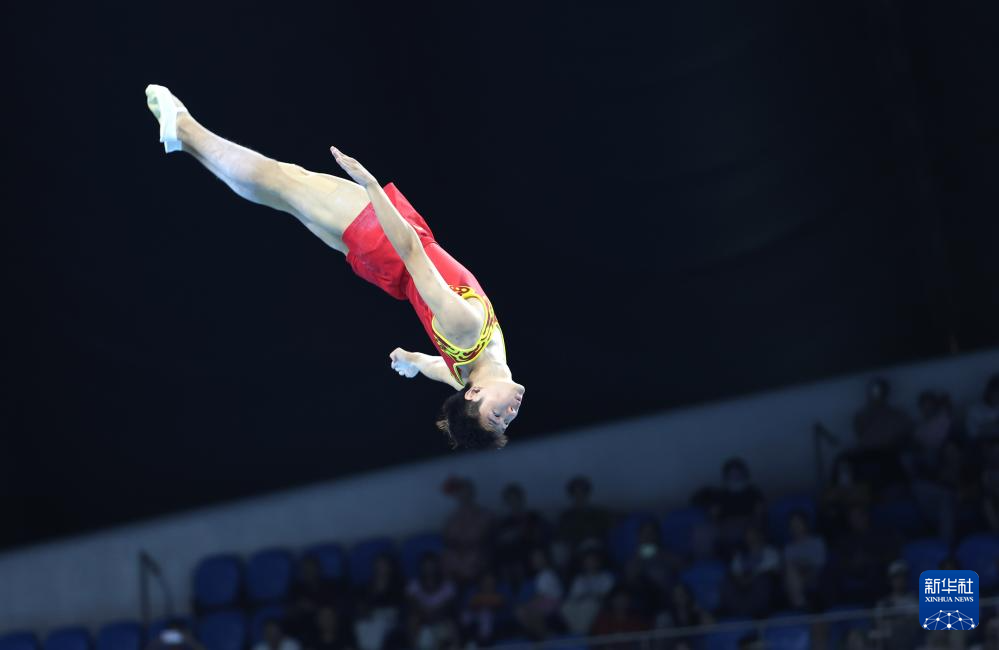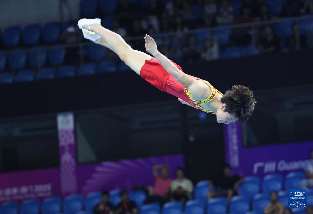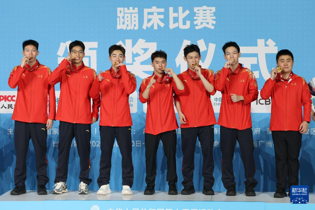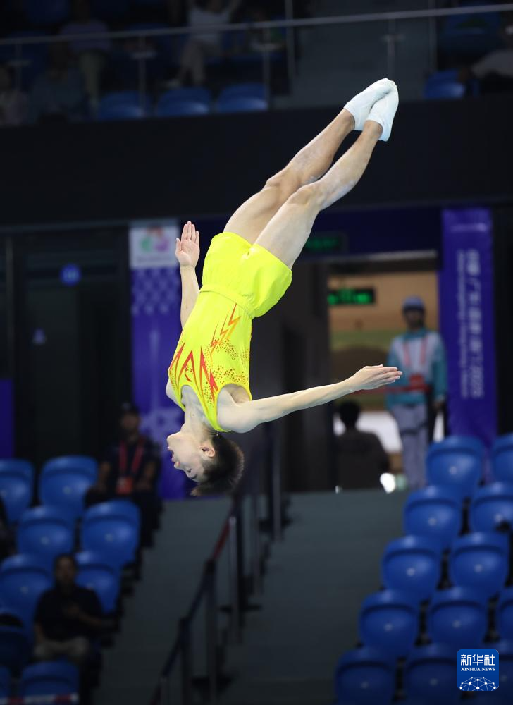 当日,第十五届全运会蹦床男子团体决赛在广州举行。