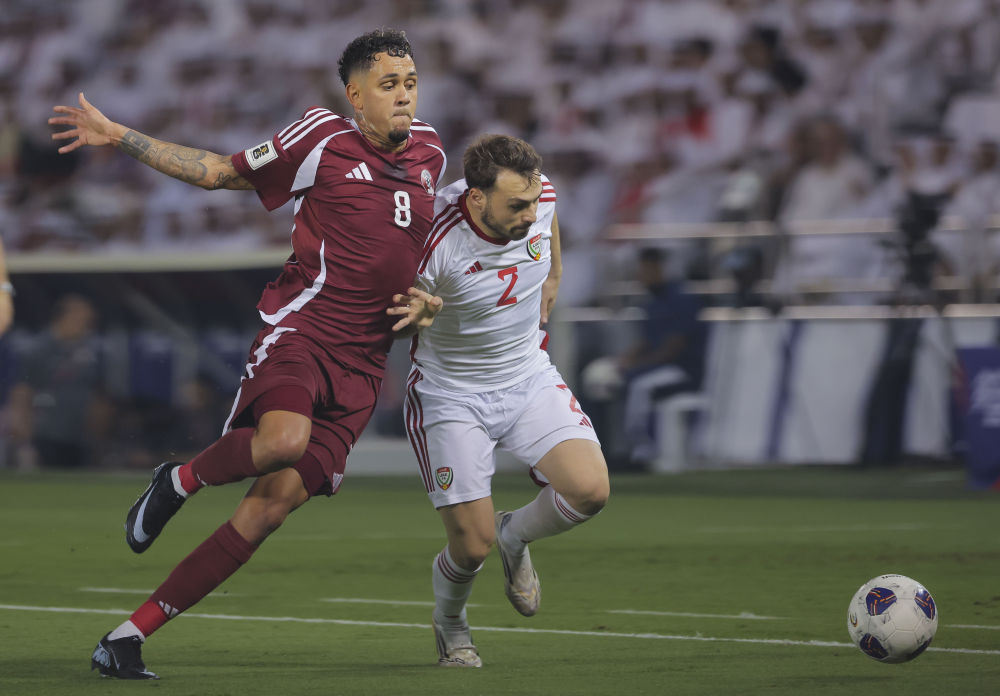 10月14日,卡塔尔队球员埃德米尔森·儒尼奥尔(左)和阿联酋队球员鲁本·阿马拉尔在比赛中拼抢。新华社发(尼库摄)