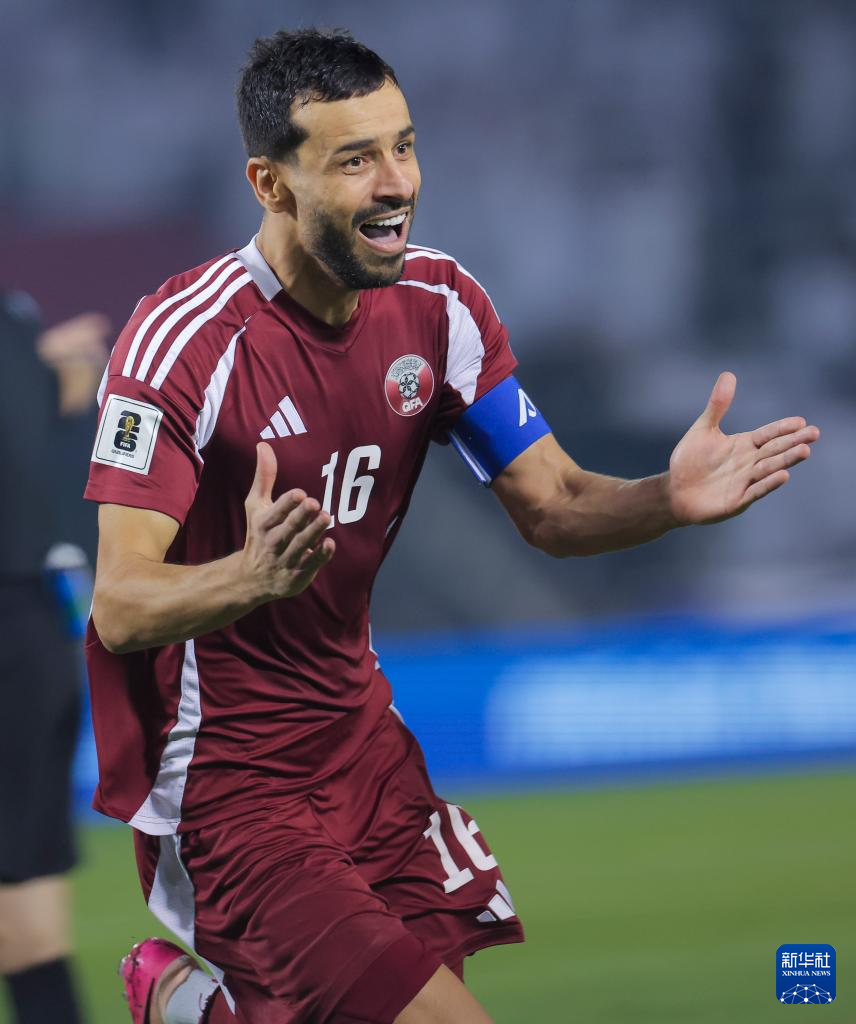 10月14日,卡塔尔队球员布阿莱姆·胡希进球后庆祝。