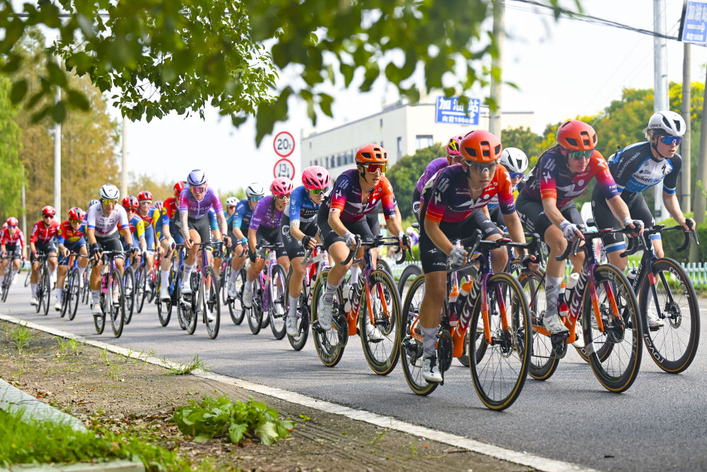 10月15日,参赛选手在比赛中骑行。当日,2025年环崇明岛国际自盟女子公路世界巡回赛第二赛段(崇东赛段)在上海市崇明区举行。新华社记者 陈浩明 摄