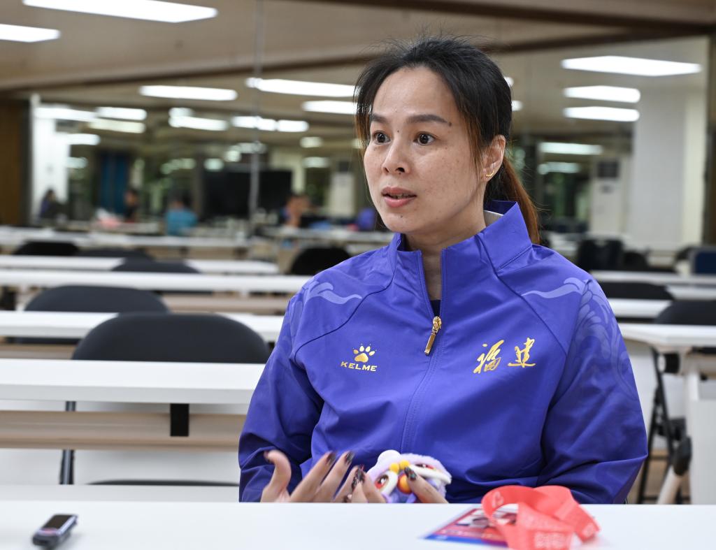 记者近日在广州体育馆见到了她——梳着马尾,手里拿着醒狮造型的十五运会吉祥物,一身福建队紫色队服,依然保留着当年运动员时期的飒爽英姿。