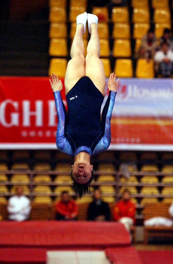 2001年,广州九运会。“那时候其实有绝对实力,但并不是没有竞争对手。我的闺蜜也是队友郑晓鋆在我前面做,做得挺好,我就有压力了。上了难度套,结果失败了。”