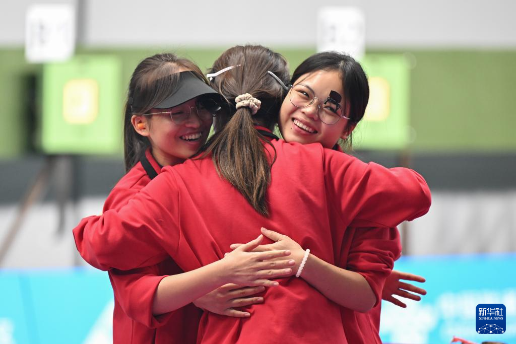 10月17日,在射击女子10米气手枪团体决赛铜牌赛后,广西队选手拥抱庆祝胜利。