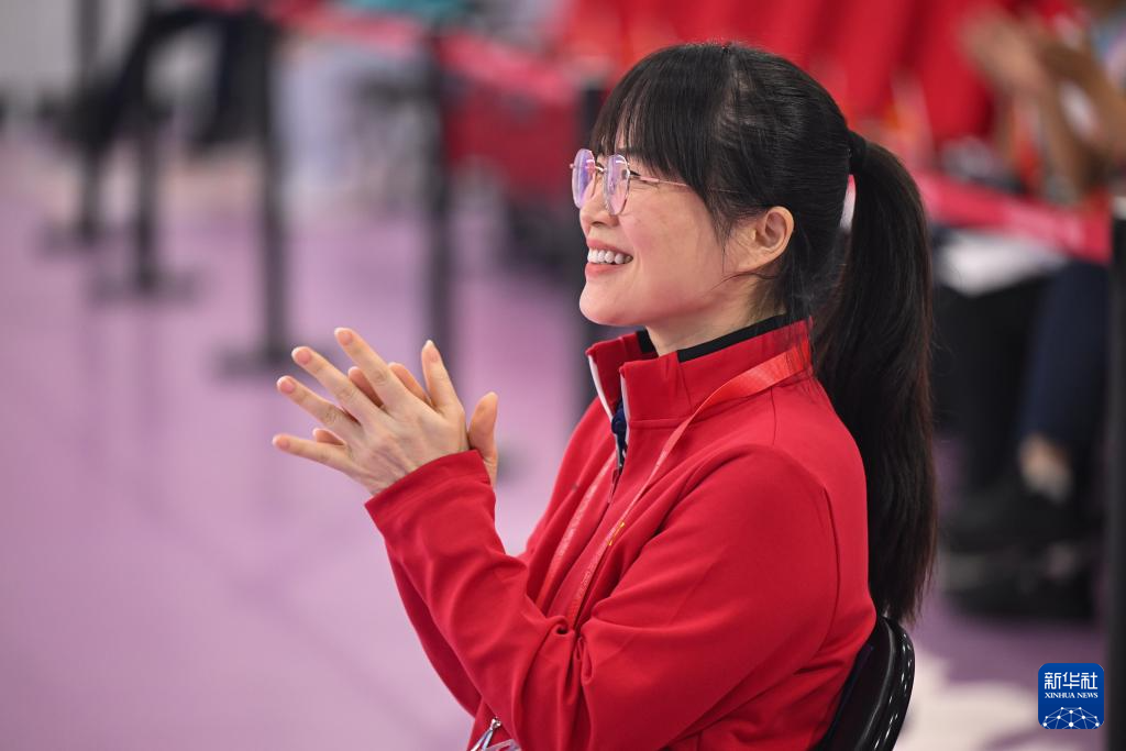 10月17日,在射击女子10米气手枪团体决赛铜牌赛中,广西队教练黎夏为队员鼓掌。
