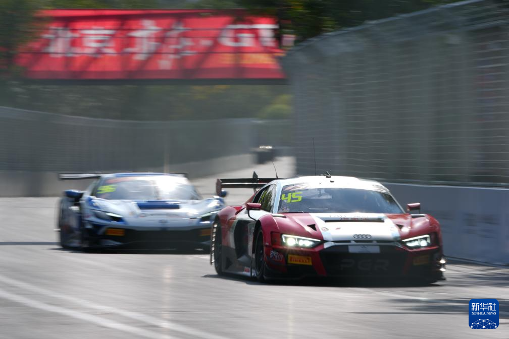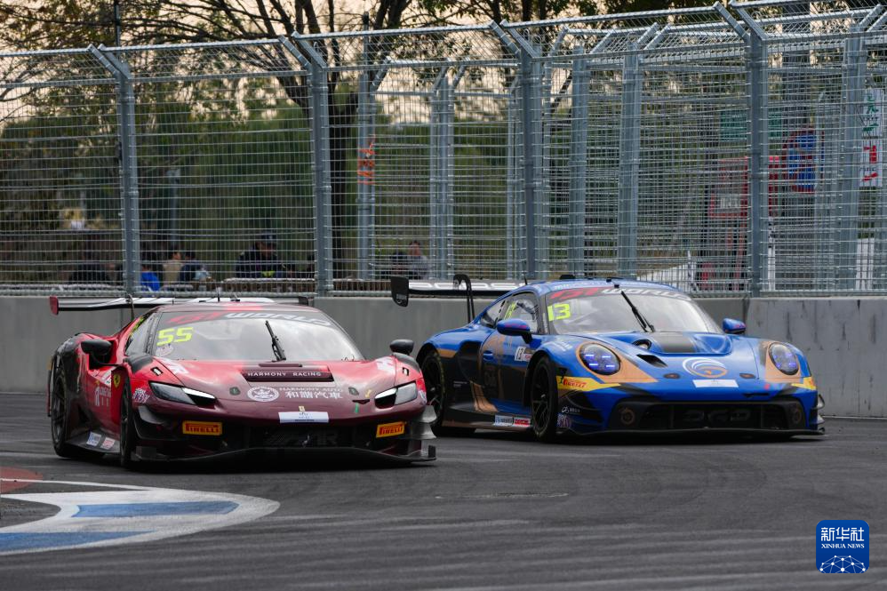 10月18日,胜地-和谐车队中国车手张亚琦/叶一飞(左)和魅影环球车队中国车手李超(中国)/方骏宇(中国香港)驾驶赛车在亚洲系列赛预排位赛中。