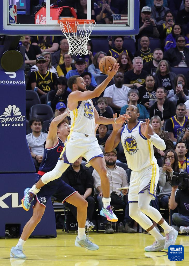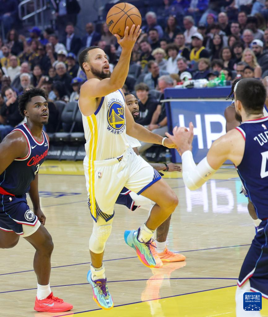 10月17日,勇士队球员库里(中)在比赛中上篮。