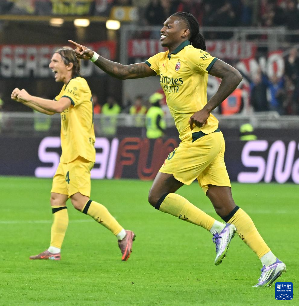 10月19日,AC米兰队球员莱奥(右)在比赛中庆祝进球。
