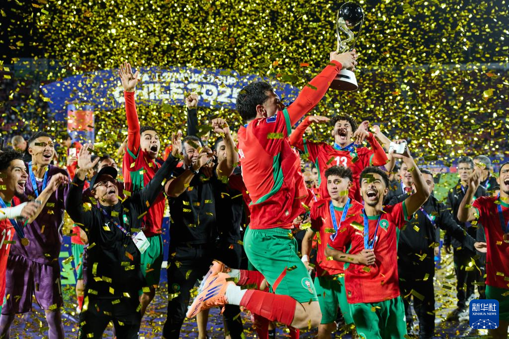 当日,在智利圣地亚哥进行的2025国际足联U20男足世界杯决赛中,摩洛哥队2比0战胜阿根廷队,获得冠军。