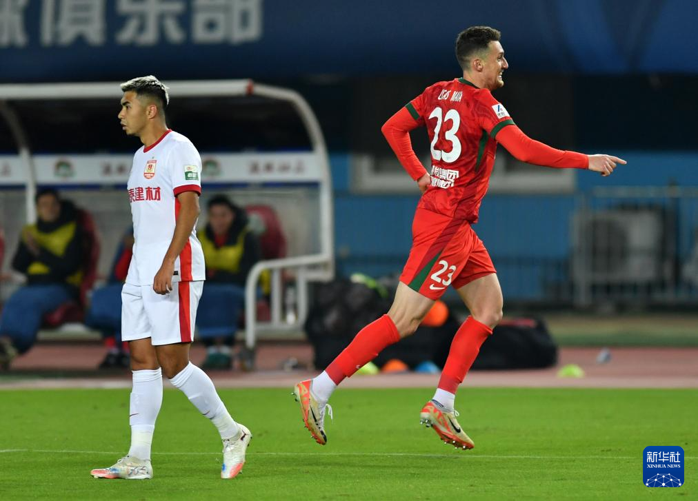 10月19日,河南俱乐部酒祖杜康队球员卢卡斯·马亚(右)庆祝进球。