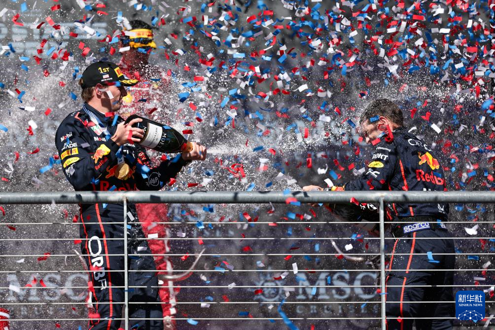 10月19日,冠军红牛车队荷兰车手维斯塔潘(左)在颁奖仪式上喷洒香槟庆祝。