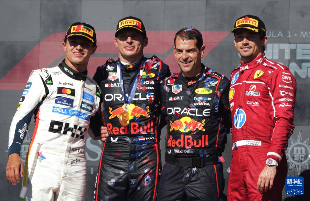 10月19日,冠军红牛车队荷兰车手维斯塔潘(左二)、亚军迈凯伦车队英国车手诺里斯(左一)和季军法拉利车队摩纳哥车手勒克莱尔(右一)在颁奖仪式上合影。