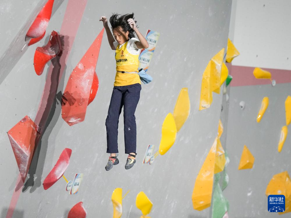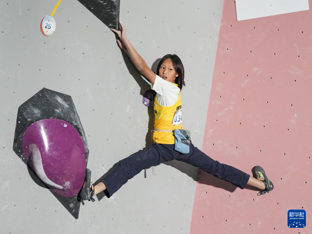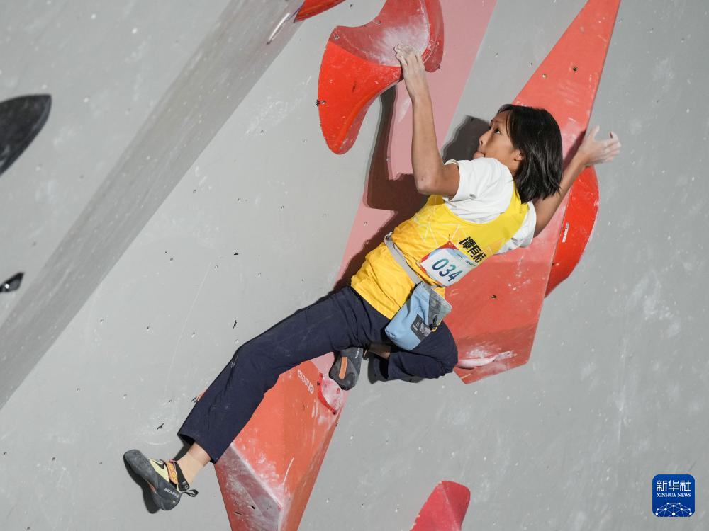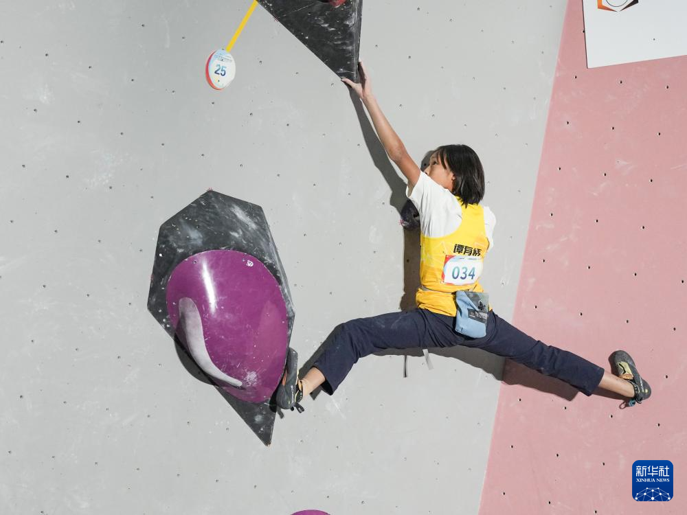 10月24日,广东省攀岩队选手谭有恬在比赛中。最终,她获得冠军。