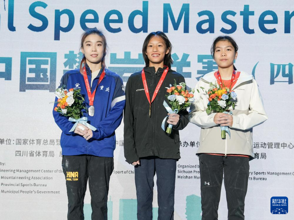 10月24日,冠军广东省攀岩队选手谭有恬(中)、亚军重庆市攀岩队选手李婧瑜(左)和季军浙江省攀岩队选手蒋晨曦在颁奖仪式上。
