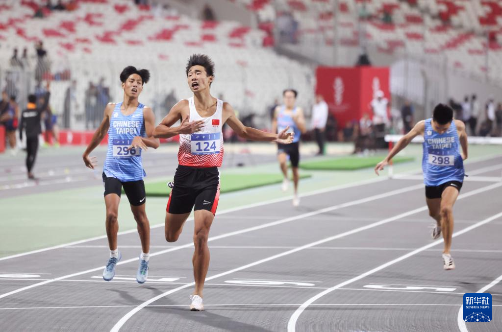 10月25日,中国选手吴明炜(左二)在男子400米栏比赛中冲过终点。最终,他夺得冠军。