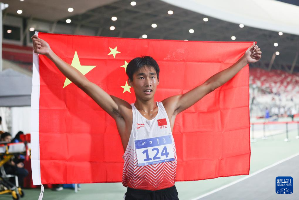 10月25日,中国选手吴明炜在男子400米栏比赛后庆祝。最终,他夺得冠军。