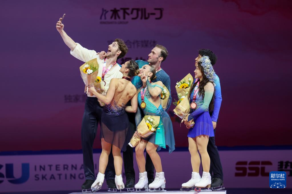 10月25日,冠军格鲁吉亚组合阿纳斯塔西娅·梅特尔基娜(前中)/卢卡·别鲁拉瓦(后中)、亚军意大利组合萨拉·孔蒂(前左)/尼科洛·马西(后左)和季军中国组合隋文静(前右)/韩聪在颁奖仪式上自拍合影。