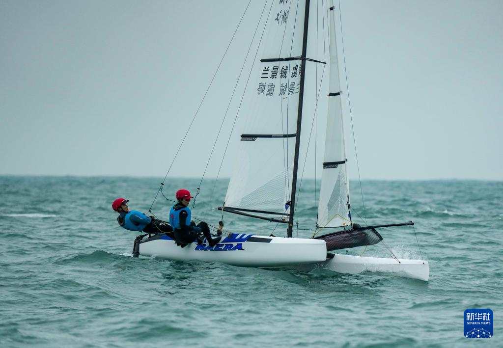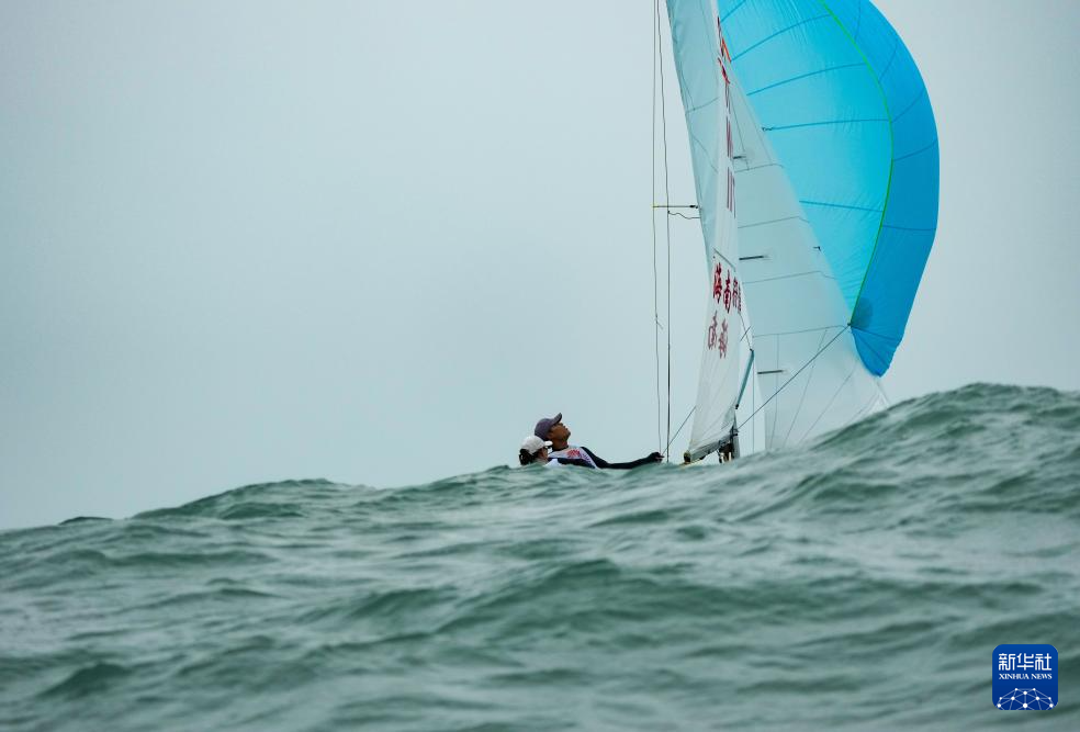 10月28日,海南队选手符倩/周政锦在混合470级第二阶段比赛中。