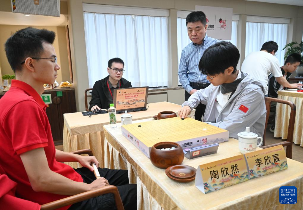 10月28日,深圳龙华队选手陶欣然(左前)与福建刺桐棋院队选手李欣宸(右前)在比赛中。