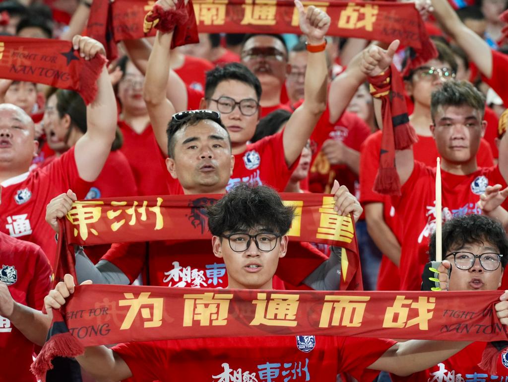 6月29日,球迷在场边为南通队加油。新华社发