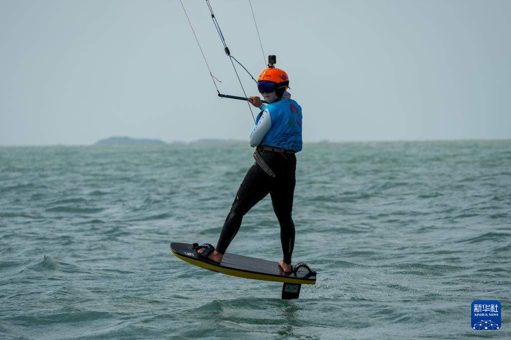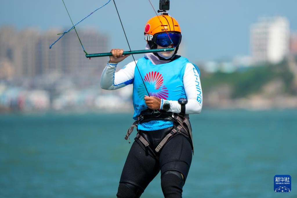 10月30日,上海队选手李婉在女子水翼风筝板级比赛前热身。最终,她夺得冠军。