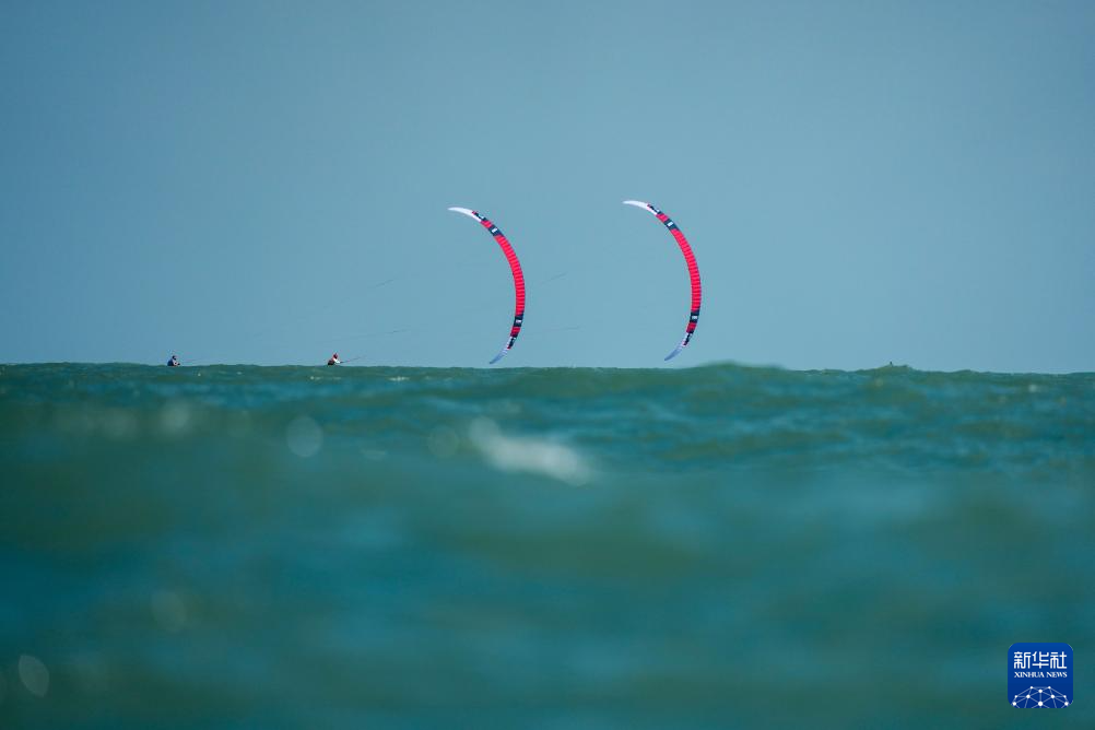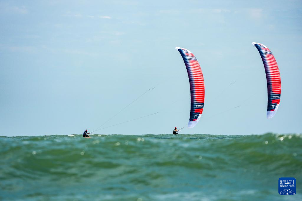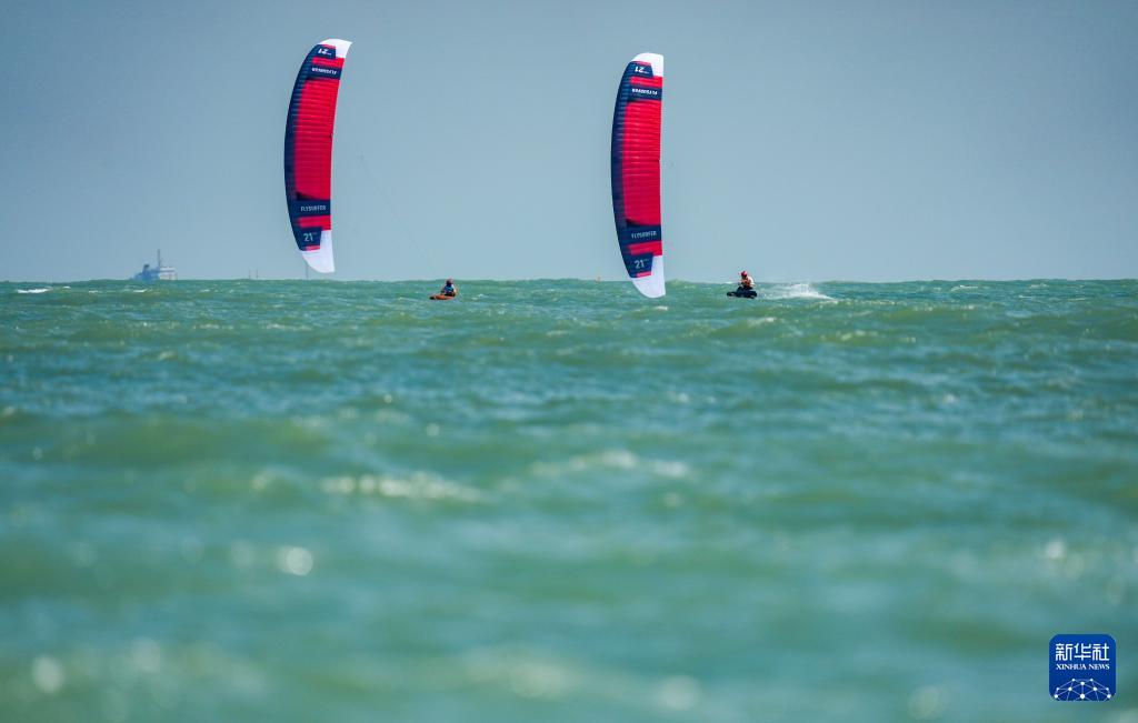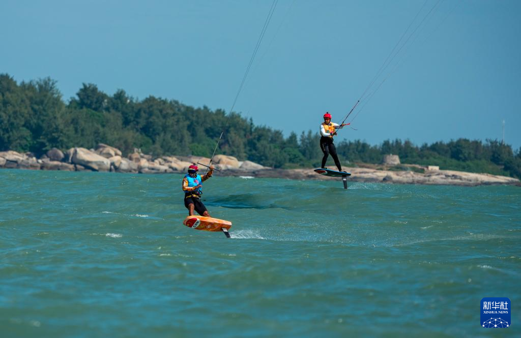 10月30日,上海队选手黄齐滨(右)与山东队选手张浩然在男子水翼风筝板级比赛中。最终,他们分获冠军、亚军。