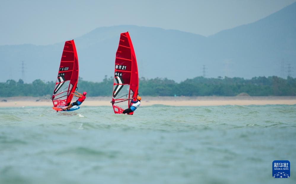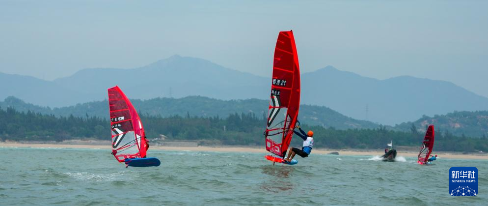 10月30日,广东队选手江千帆(左)和香港队选手郑清然(中)在男子水翼帆板级奖牌赛比赛中。最终,江千帆获得季军,郑清然获得第四名。