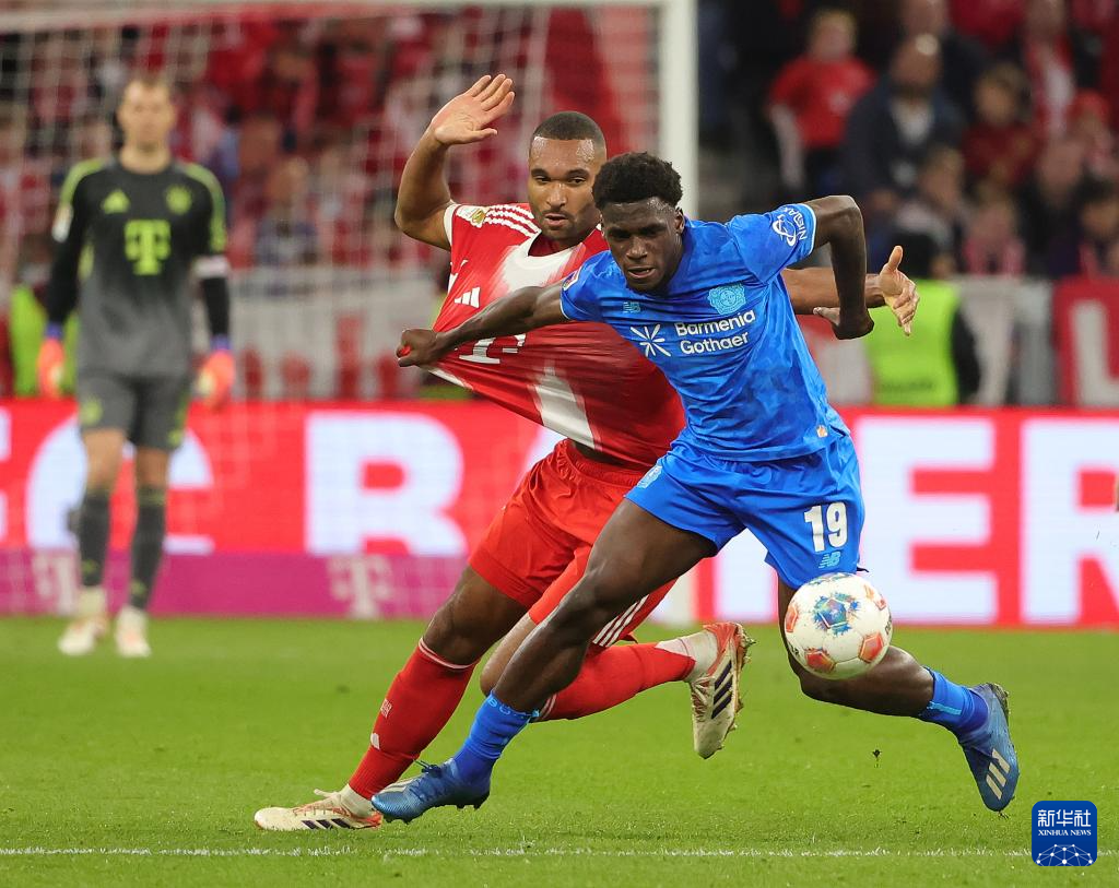 11月1日,拜仁慕尼黑队球员塔赫(左)和勒沃库森队球员波库在比赛中拼抢。