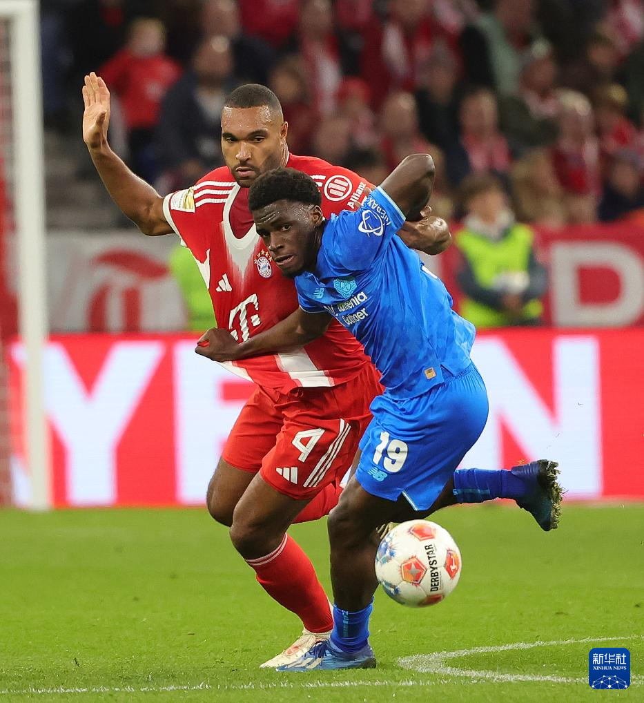 11月1日,拜仁慕尼黑队球员迪亚茨(中)和勒沃库森队球员匡萨(右)、安德里希在比赛中拼抢。