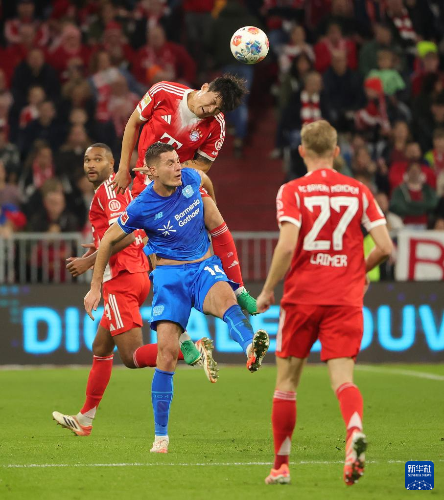 11月1日,拜仁慕尼黑队球员金玟哉(上)和勒沃库森队球员希克(中下)在比赛中争顶头球。