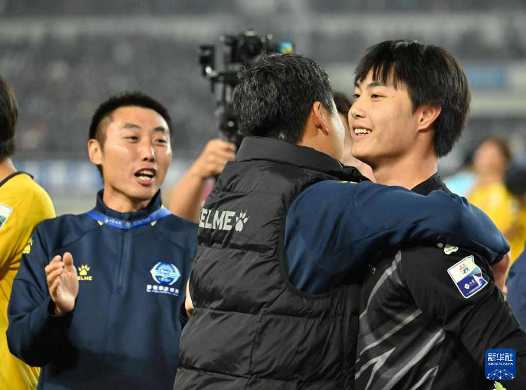 11月1日,泰州队守门员戴曜城(右)庆祝胜利。