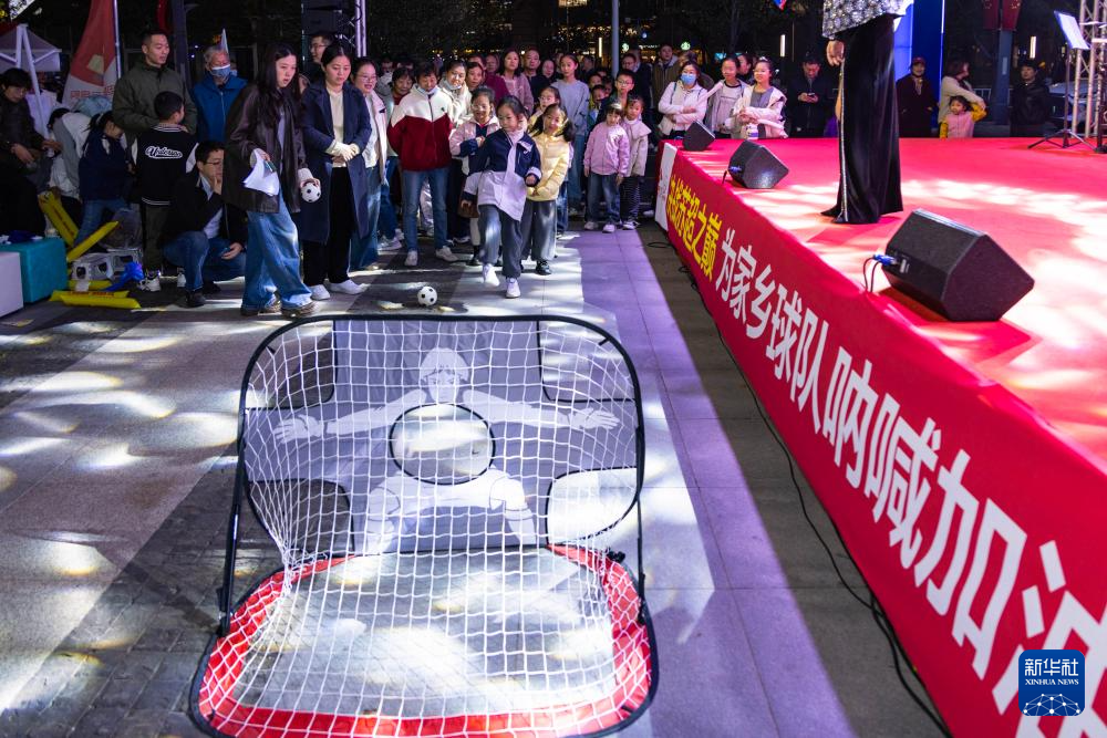 11月1日,小朋友在江苏泰州金融中心广场体验“点球大战”游戏。
