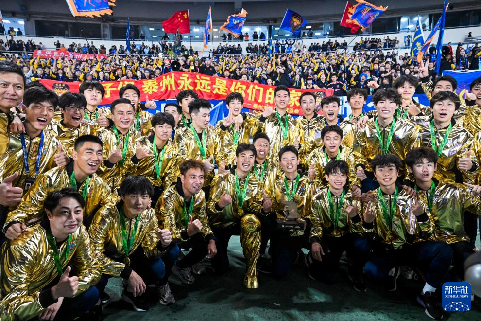 11月1日,冠军泰州队在夺冠后合影。