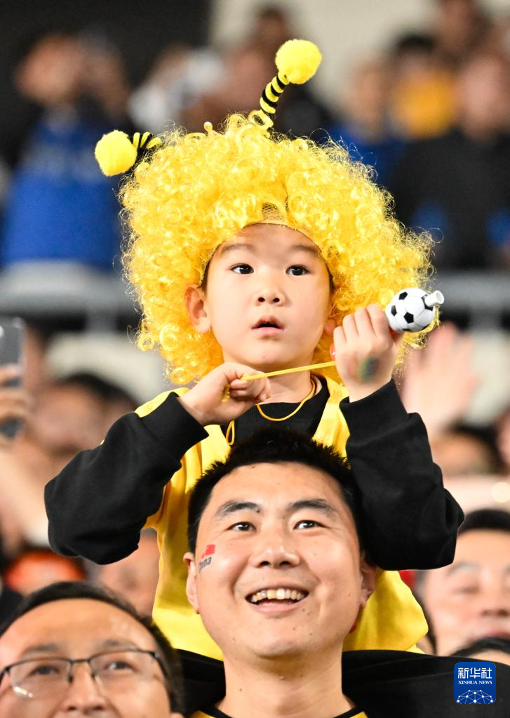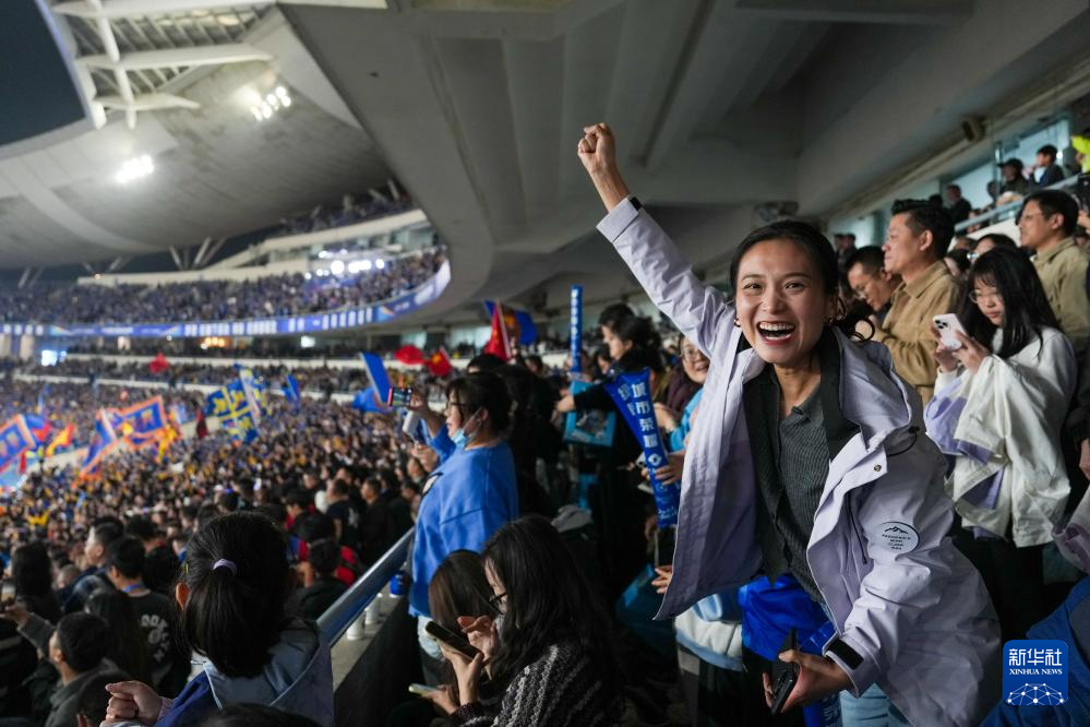 11月1日,一名球迷在看台为双方球队加油。
