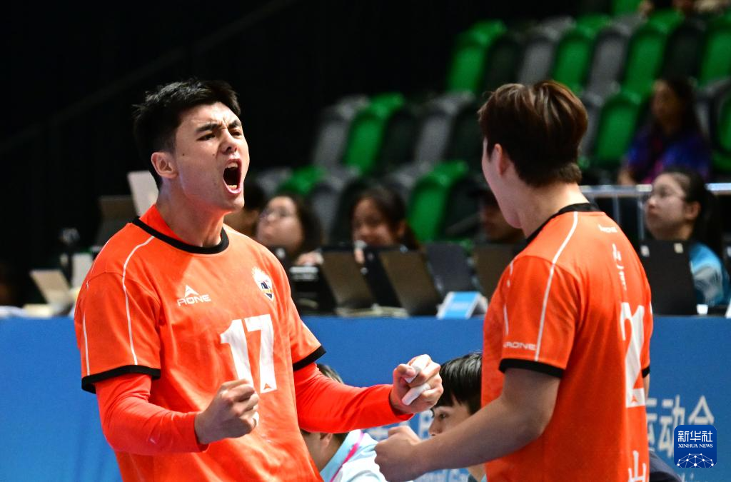11月2日,山东队球员胡晋铭(左)与队友在赛后庆祝获胜。