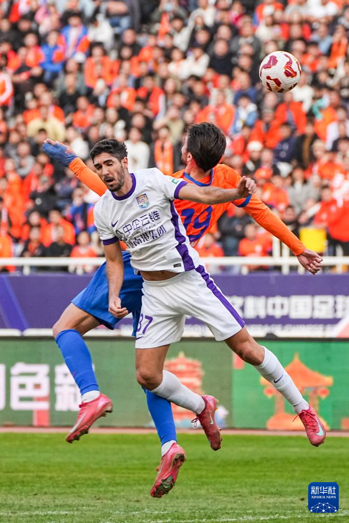 11月1日,天津津门虎队球员胡安·罗斯(前)在比赛中和山东泰山队球员泽卡争顶。