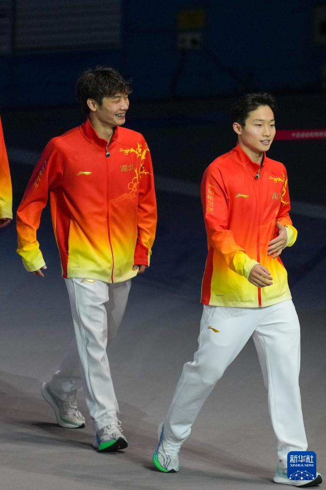 11月3日,湖北队组合王宗源(右)/郑九源在男子双人3米跳板比赛前入场。
