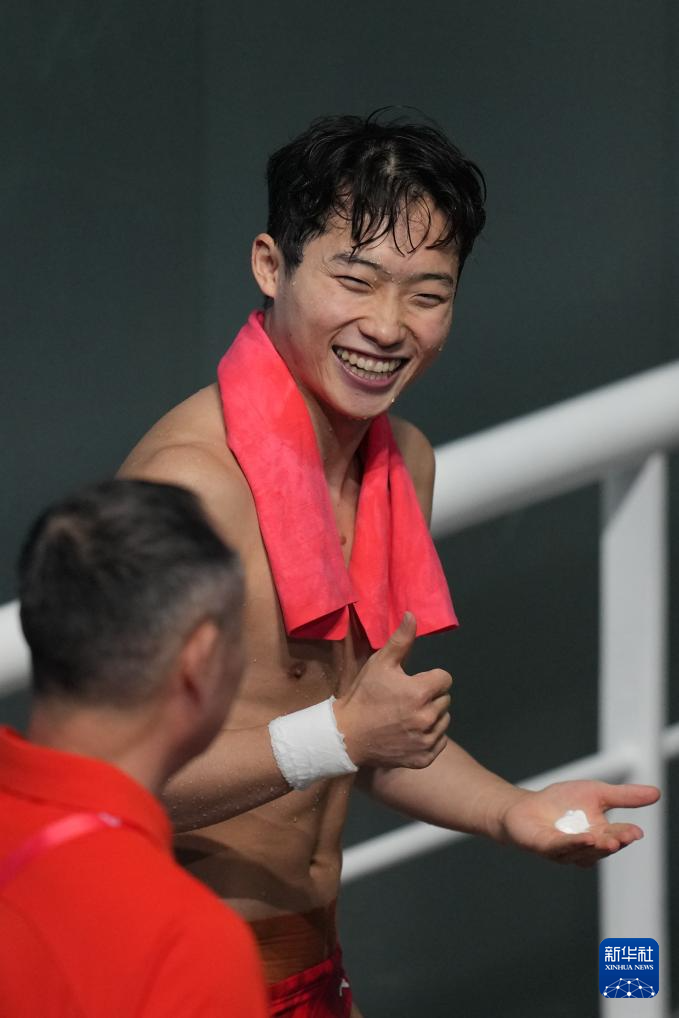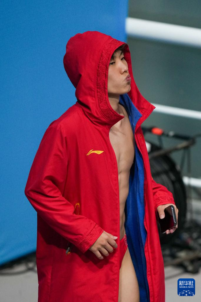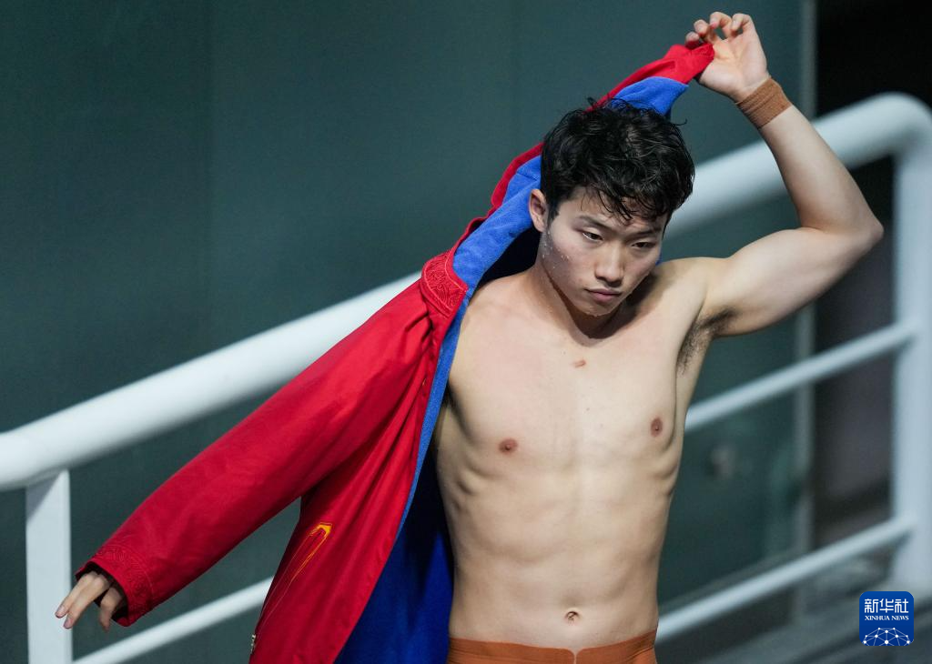 11月3日,湖北队选手郑九源在男子三米板比赛间隙。