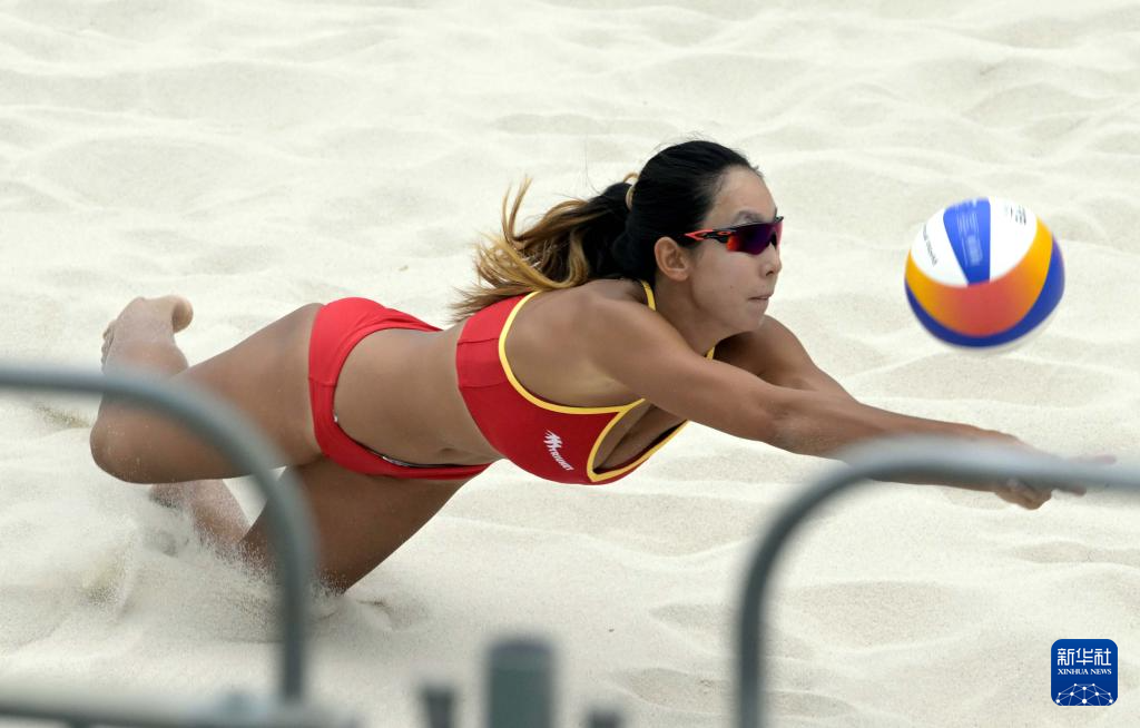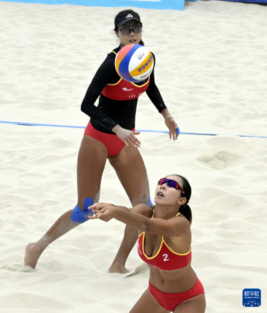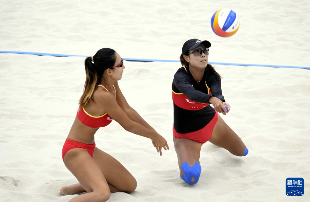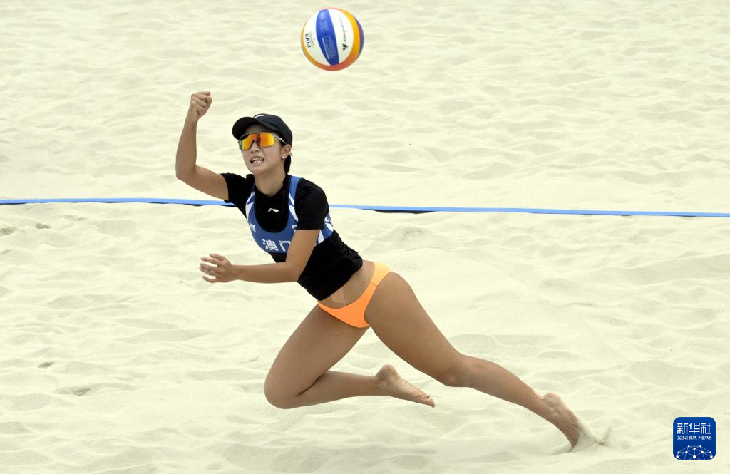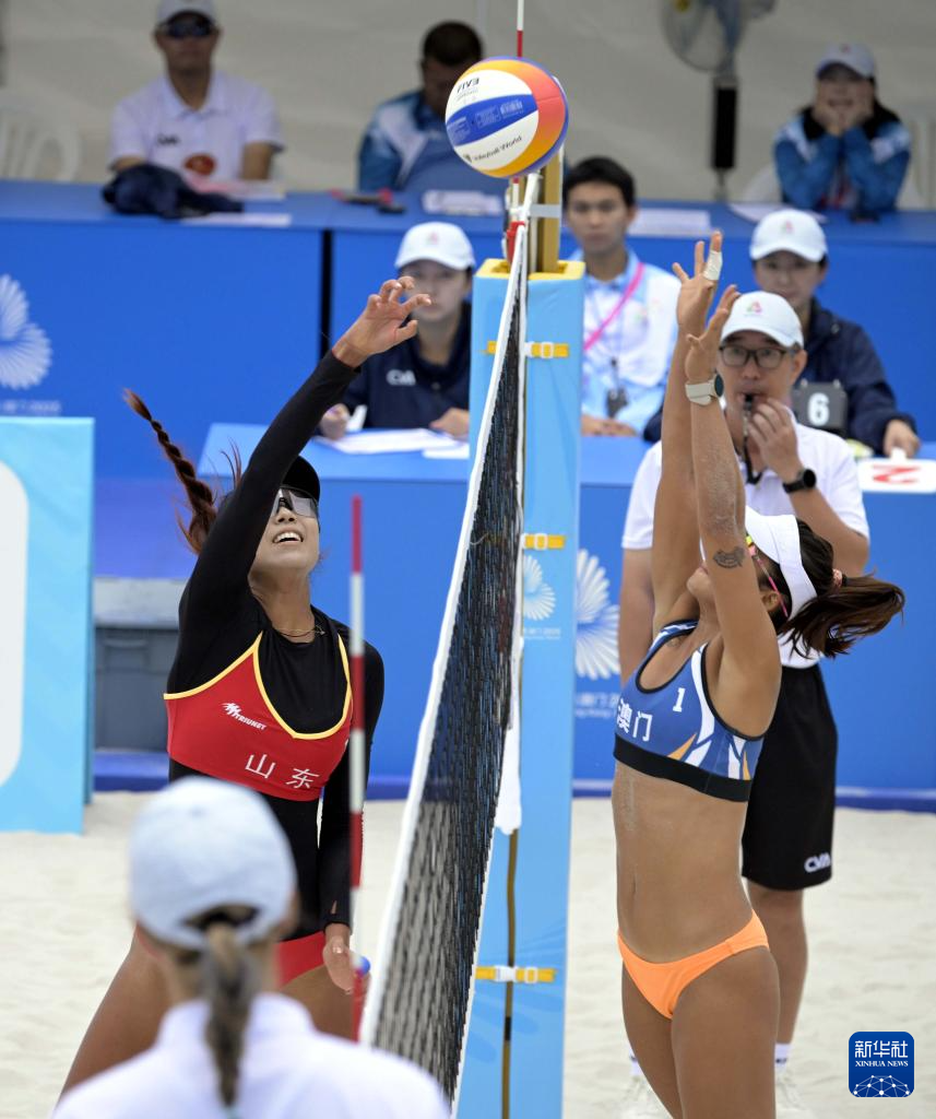 当日,在香港举行的第十五届全国运动会沙滩排球女子小组赛E组比赛中,山东队组合曹舒婷/董颉2比0战胜澳门队组合梁安盈/罗咏心。