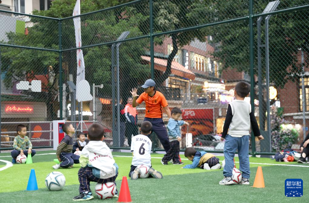 11月3日,在广州市越秀区大东街的均益球场,教练在教小朋友踢球。