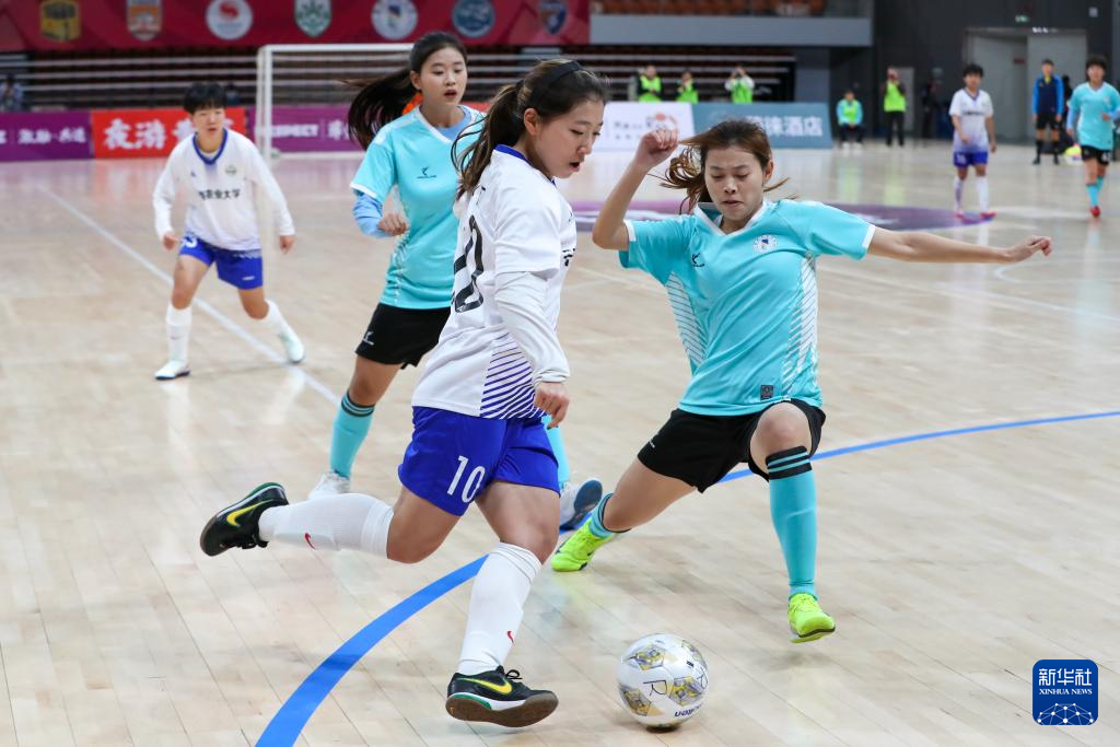 11月5日,云南玉昆农大女足队球员张艳(左)与首都体育学院队球员何恩娴在比赛中拼抢。