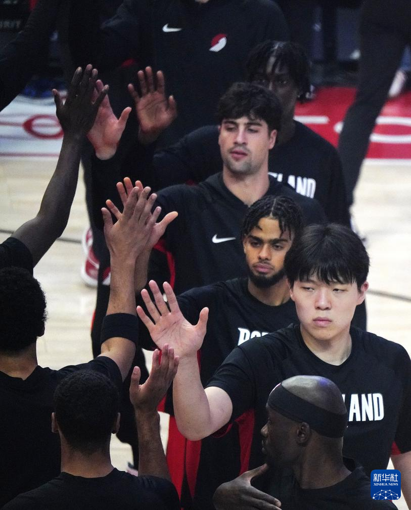 11月5日,开拓者队球员杨瀚森(右一)在开场前和队友互动。