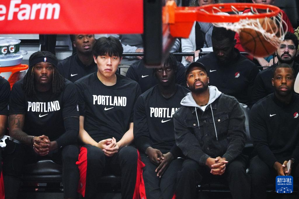11月5日,开拓者队球员杨瀚森(左下)在场外观战。