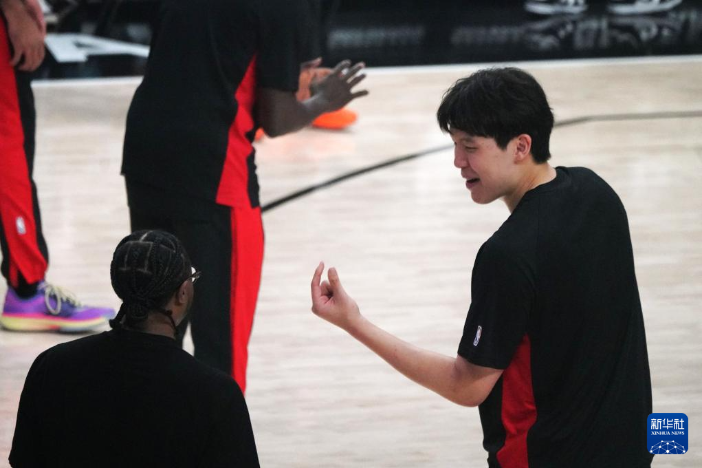 11月5日,开拓者队球员杨瀚森赛前和队友交流。