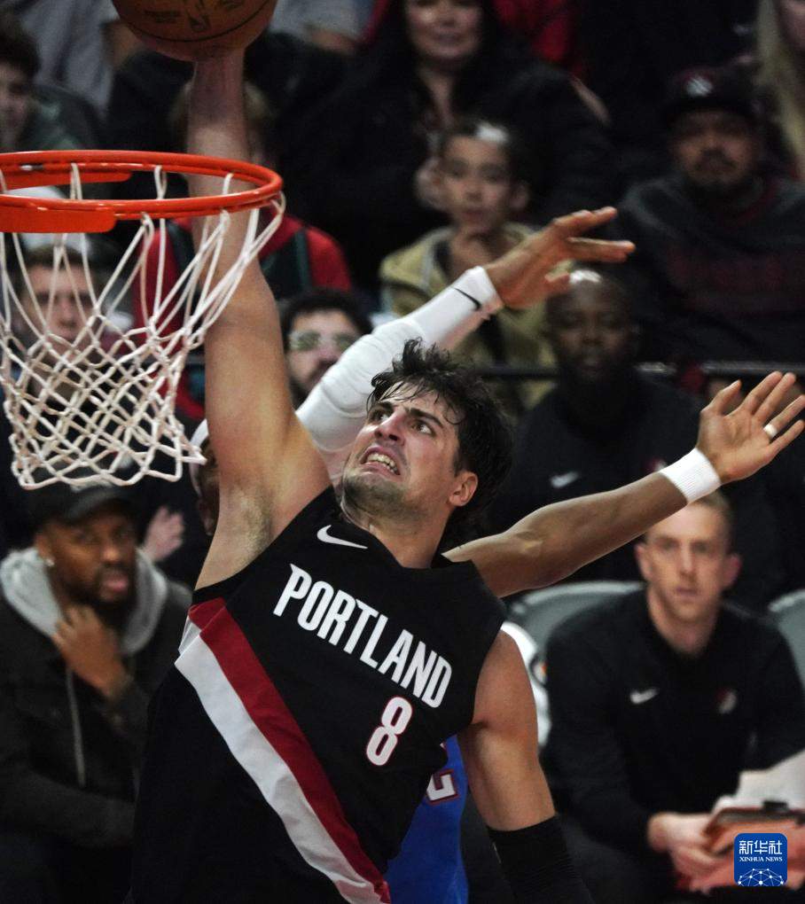 11月5日,开拓者队球员德尼·阿夫迪亚(前)在比赛中扣篮。
