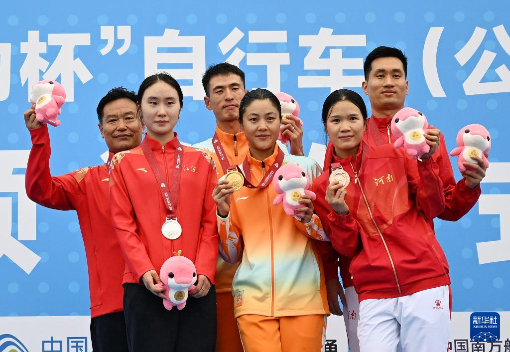 11月7日,冠军海南队选手张好(右三)、亚军江苏队选手魏苏婉(左二)、季军河南队选手陈思(右一)在颁奖仪式上。